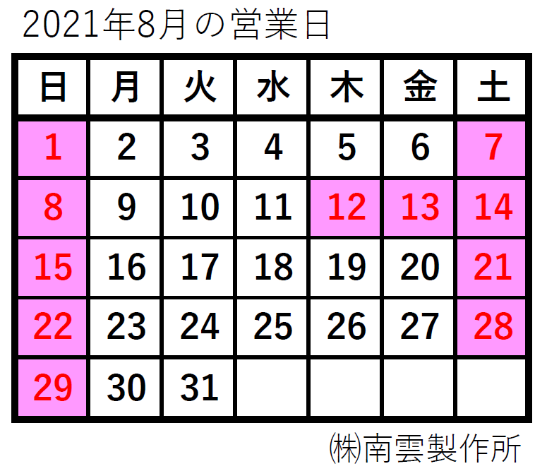 2021年8月の営業日のご案内です。