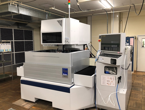 西部電機製ワイヤー放電加工機の中でも最大サイズです。加工液は水仕様でφ0.2ワイヤーを使用します。主に金型のプレート加工を得意とし、西部電機の持ち味である高い機械精度と、恒温室に近い温度管理でピッチ精度±0.001㎜~を実現します。