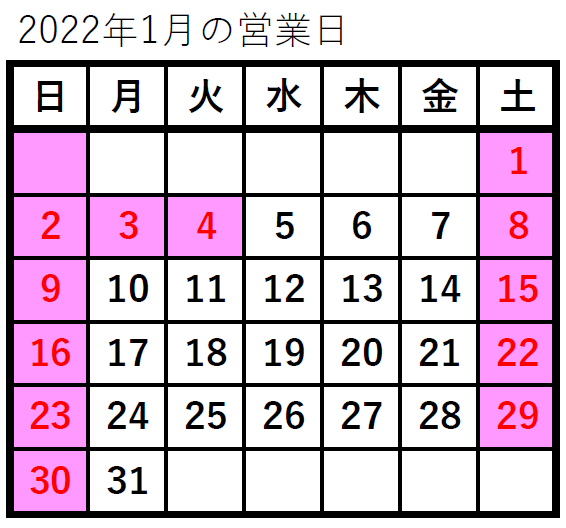 2021年12月~2022年1月の営業日のご案内です。